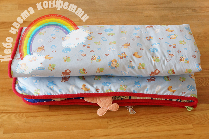 Надо сказать, что этот коврик скорее рассчитан на малышей, поэтому совсем съемных деталей нет: что-то отсоединяется, на липучке, на шнурочке, но все пришито за веревочки к основе. Так что ничего не потеряется ;)